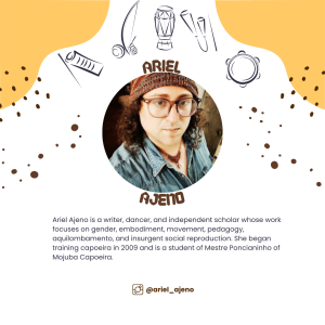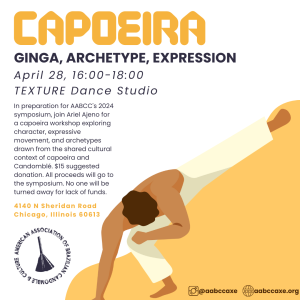 In preparation for AABCC’s 2024 symposium, join Ariel Ajeno for a capoeira workshop exploring character, expressive movement, and archetypes drawn from the shared cultural context of capoeira and Candomblé. $15 suggested donation. All proceeds will go to the symposium. No one will be turned away for lack of funds.